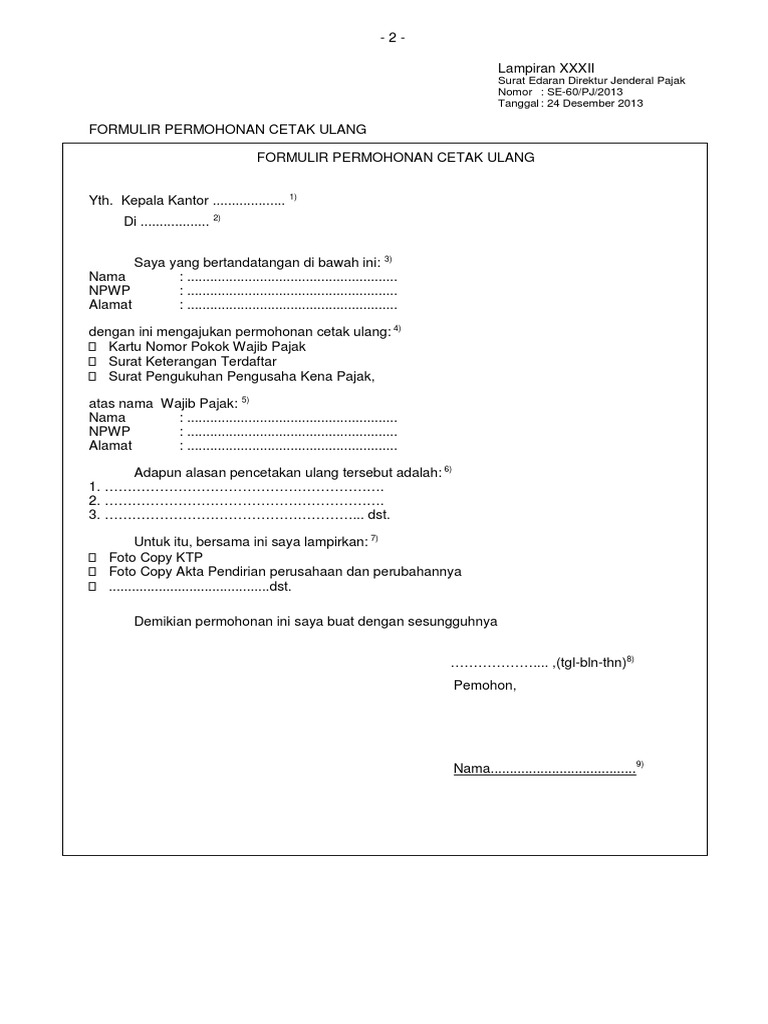 Formulir Permohonan Cetak Ulang Kartu NPWP Dan Petunjuk Pengisiannya Dan Petunjuk Pengisian